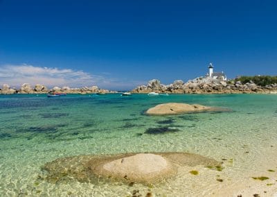 Aujourd’hui, vous passez par l’Aber Wrac’h, ce célèbre bras de mer qui remonte dans les terres, et vous rejoignez Plouguerneau et le phare de l’ile Vierge. C’est le plus haut phare d’Europe, fait de pierres de taille ; il se visite et vous devez gravir les 397 marches pour arriver en haut des 82 m et avoir une vue panoramique imprenable sur la côte des naufrageurs et les Abers !