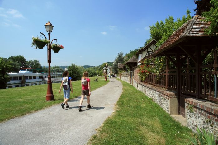 Sur cette étape vous longez la Seine depuis Rouen pour rejoindre tout d’abord la Bouille située à ~20 km. Les clochers de la capitale normande laissent place aux grues du premier port exportateur de céréales d’Europe qui accueillent des cargos gigantesques mesurant presque 300 mètres pour les plus longs ! Petit à petit, l’ambiance portuaire laisse place aux villages de grès et colombages si typiques de la Normandie. Vous voici au cœur du Parc Naturel Régional des Boucles de la Seine Normande où règne une ambiance reposante rythmée par le va-et-vient des navires. Avant de prendre le bac de Seine pour rejoindre La Bouille, faites une halte aux jardins du château de Soquence qui offrent un très beau point de vue sur le fleuve. Sur l’autre rive, vous apercevez le château de Robert le Diable, gardien de cette boucle de la Seine. La Bouille, village natal d’Hector Malot et source d’inspiration pour les peintres impressionnistes constitue une halte agréable.